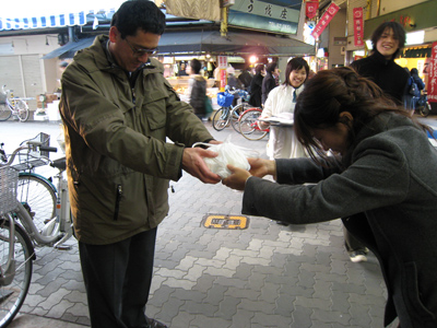 石橋商店街の現地調査を実施した。今回は、阪急石橋駅西口を出て左手の阪大下通りを重点的に調査した。受講学生は2人1組に分かれ、店主への聞き取りを中心に調査を進めていった。聞き取りを行うことができた店は多くないものの、店主1人1人からじっくりと熱心に話をうかがう姿が印象的であった。