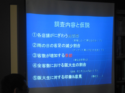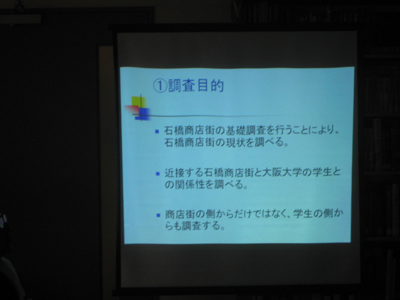 C班のスライド。石橋商店街と阪大生の関わりを調べるため、阪大生にアンケート調査も行っていました。