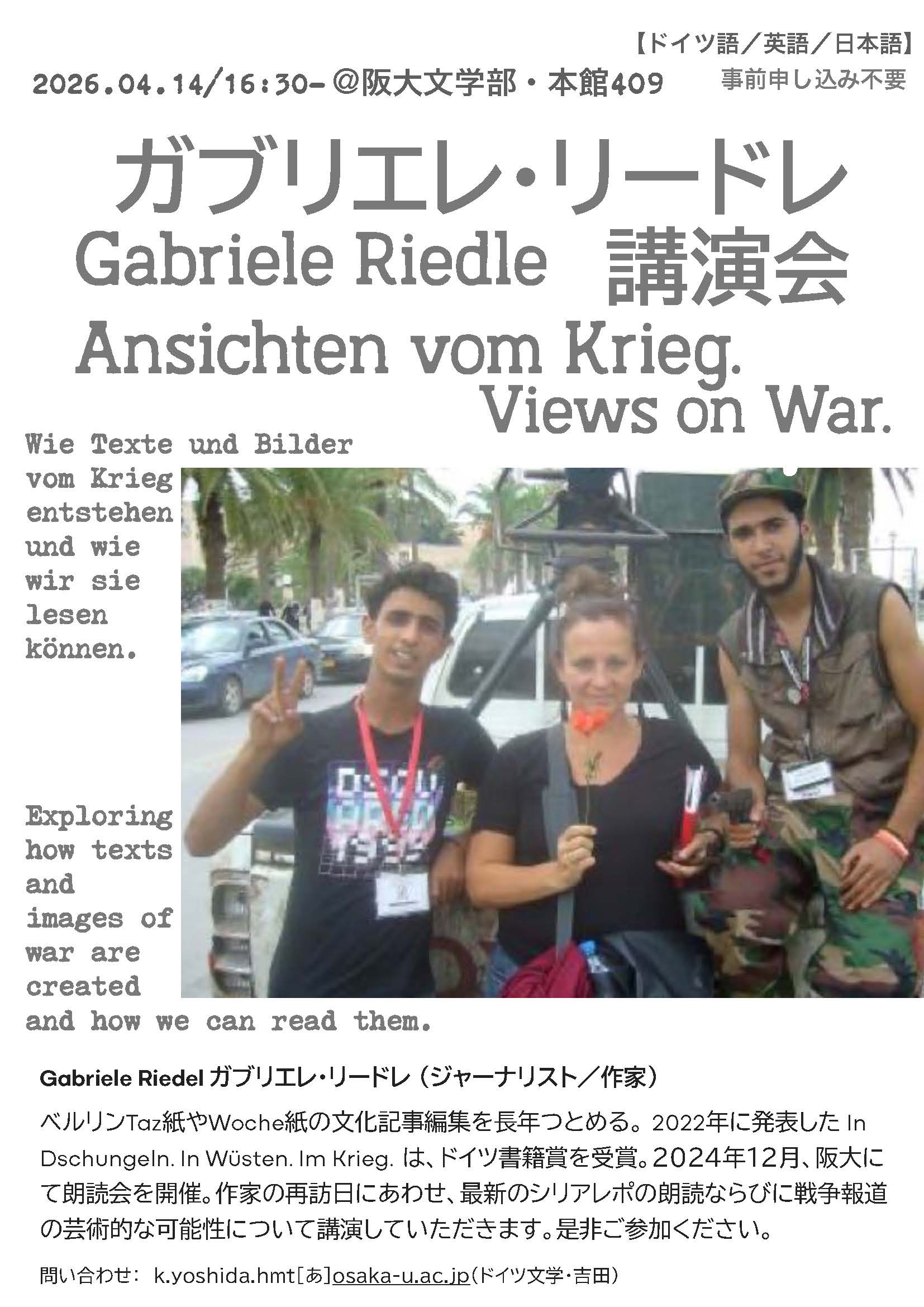 ドイツ文学研究室では、ドイツのジャーナリストであり作家のガブリエレ・リードレさんの訪日にあわせて、戦争報道についての講演会"Ansichten vom Krieg / Views on War"を開催します。
