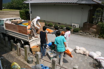 | 大学に全ての機材が到着すると、皆で綺麗に拭いて泥を落としてから整理しました。 | ![]() 大学で機材を下ろしているところです。 |