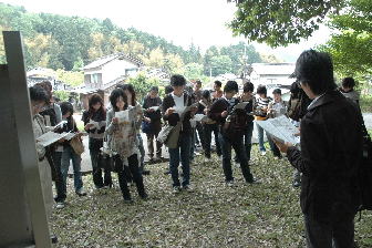 次に見学したのは、戊申年銘鉄刀が出土したことで著名な箕谷古墳群です。石室内に復元された副葬品配置にみんな興味津々です。 |