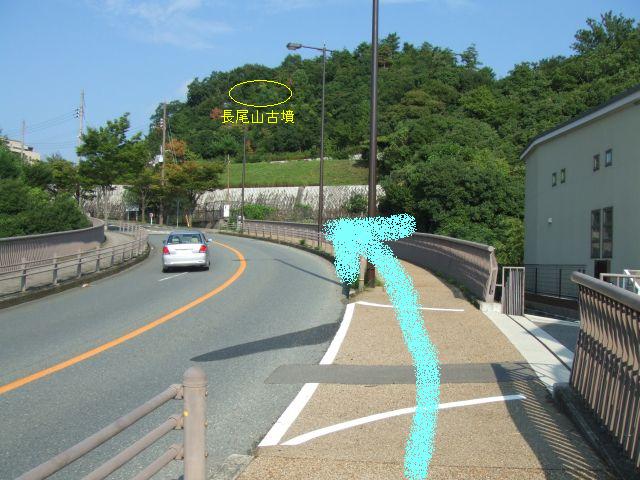 歩道を道なりに進むと、前方に長尾山古墳のある山が見えてきます。