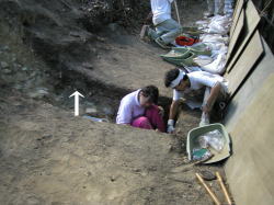 | 前方部南トレンチでは、全景の写真撮影が終了し、壁面などの細部写真を撮影していった。 明日は午前中に残りの細部写真を撮影し、午後から、図面作成のための割り付けに入る。 |