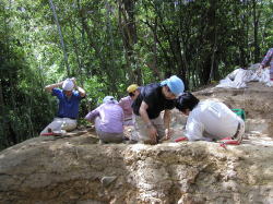 | 東クビレ部トレンチでは平面図にコンターラインを入れ、全ての作業が終了した。その後、埋め戻しを行った。 | ![]() 東クビレ部トレンチを南東から |