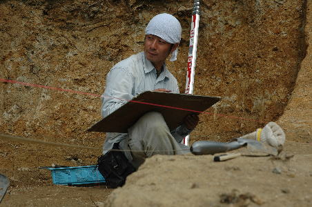 調査担当者(寺前)が土層注記を行っているところです。幾重にも堆積する土の色や粒土、混入物を記録することにより、どのような時代の遺構を発掘しているかを認識し、客観的に記録していきます。 |