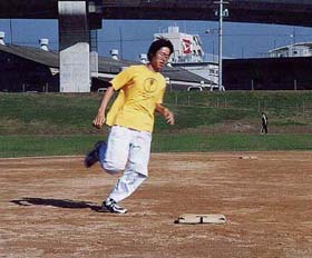 しかし,奇跡は起こった。最終回5回の攻撃時,濱島教授から「諸君,存分に闘っていただきたい!」とのお墨付きを伝え聞くやいなや戦意は大いに高揚,打線はマシンガンの如し。圧巻は長田のライト越えホームラン!【写真:三塁を回るぞ之図】この怒涛の攻撃が接戦をものにする。